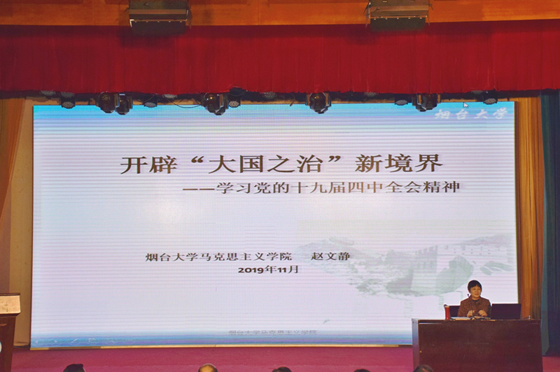 为深入学习贯彻党的十九届四中全会精神,11月29日上午,学习贯彻党的十九届四中全会精神省委宣讲团成员、烟台大学马克思主义学院教授赵文静来到我院,为全体教职员工和学生代表作了题为《开辟“大国之治”新境界》的宣讲报告。党委书记唐家弘主持报告会。
