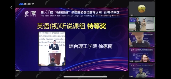 5月21日,第十三届“外教社杯”全国高校外语教学大赛山东省决赛在云端落幕。烟台理工学院参赛教师、团队在大赛四个组别的赛事中取得历史性突破,获得特等奖一项,一等奖一项,三等奖两项。我校教师徐家南荣获(视)听说课组特等奖,并将于年底作为山东省唯一代表参加该组别的全国赛;于巧丽团队荣获英语思政微课组一等奖;许月娟和过春燕分别荣获日语综合课组和英语综合课组三等奖。