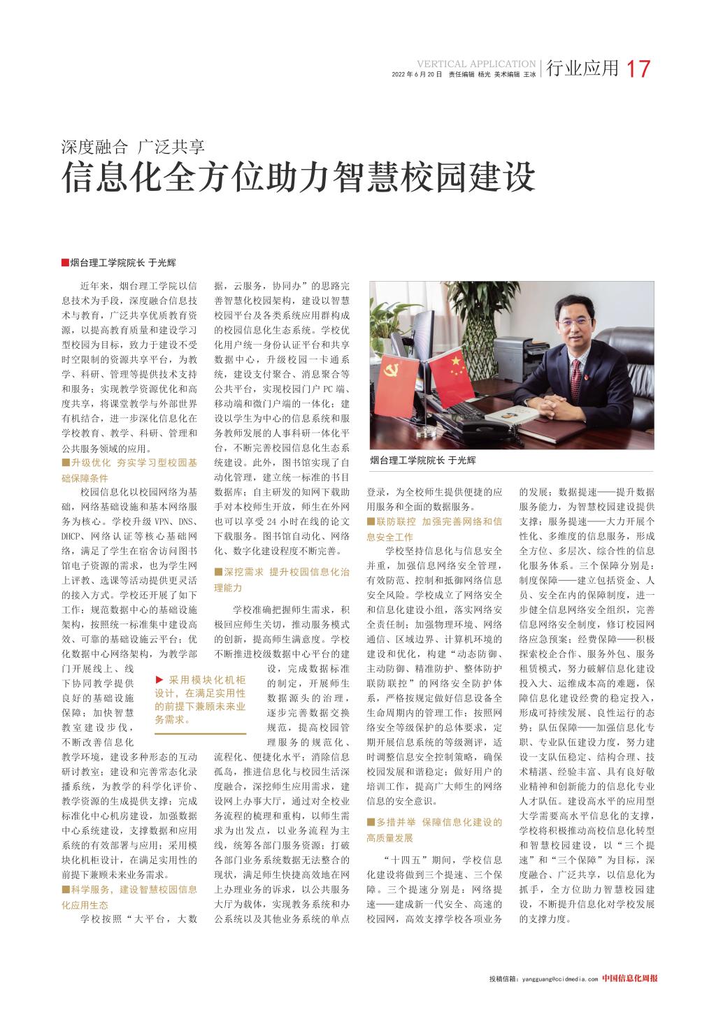 近日,中国信息化周报以《信息化全方位助力智慧校园建设》为标题对我校的信息化校园建设实践成果进行了整版报道。近年来我校以信息技术为手段,深度融合信息技术与教育,广泛共享优质教育资源,以提高教育质量和建设学习型校园为目标,致力于建设不受时空限制的资源共享平台,为教学、科研、管理及文化生活等提供有效技术支持和服务;实现教学资源优化和高度共享,将课堂教学与外部世界有机结合起来,进一步深化了信息化在学校教育、教学、科研、管理和公共服务领域的应用。