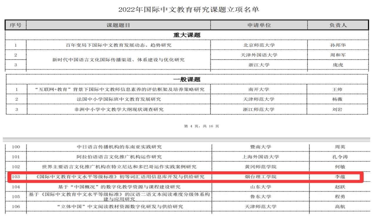近日,教育部中外语言交流合作中心(简称“语合中心”,原国家汉办)公示了2022年度国际中文教育研究课题名单,我校信息工程学院李蕴副教授主持申报“《国际中文教育中文水平等级标准》初等词汇语用知识库开发与供给研究”的项目获得资助,资助经费5万元。这是我校首次获教育部科研项目立项。