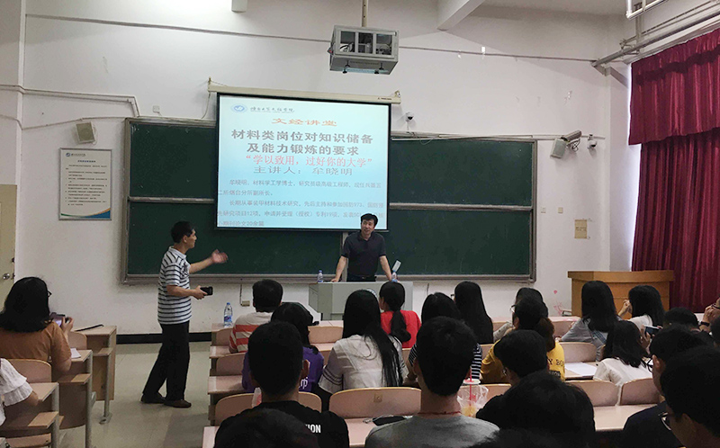 7月8日晚,中国兵器工业第五二研究所烟台分所副所长牟晓明研究员做客文经讲堂,在二教109教室给机电系师生做“材料类岗位对知识储备及能力锻炼的要求”主题讲座。机电工程系主任教授王卓、教研室主任王亚平及金属材料工程专业全体师生聆听了此次讲座。